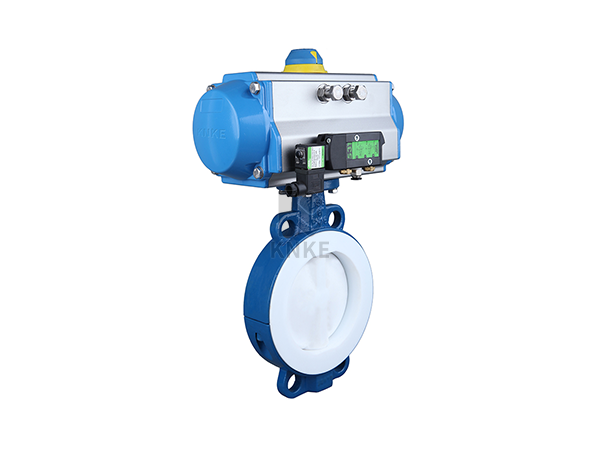 气动衬氟蝶阀,Pneumatic fluorine lined butterfly valve,是由188彩票KNKE的气动执行器和全衬四氟的蝶阀组成的阀门,采用带有球形密封表面的衬聚四氟乙烯包衬蝶板,四氟蝶阀是为了适应一些具有强酸、强碱的腐蚀性环境,石油、化工、食品等多个特殊领域的需要,使用聚四氟乙烯制成的阀体,具有很强的防腐效果。广泛适用于各种不同类型工业管道中液体和气体(包括蒸气)的输送,有严重腐蚀性介质的使用场合,如:硫酸、氢氟酸、磷酸、氯气、强碱、王水等具有强腐蚀性的介质,应用于化工等工业过程中对腐蚀性流体的控制,是调节或切断各种化学腐蚀性介质的解决方案。