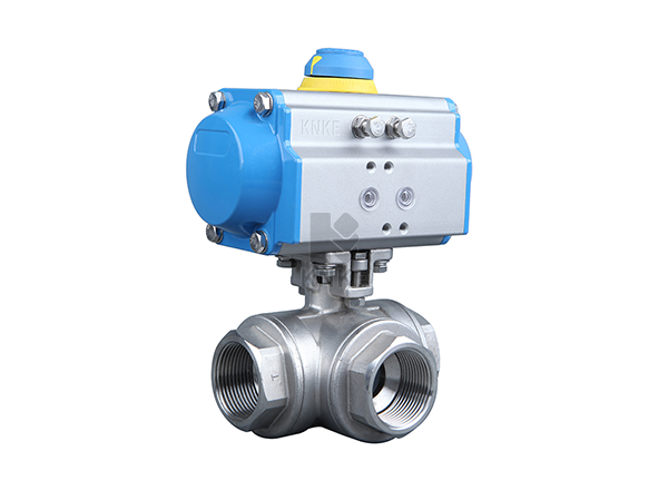 气动三通内螺纹球阀,Pneumatic three-way internal thread ball valve,是由188彩票KNKE的气动执行器和三通内螺纹球阀组成,可以用于实现介质流向的切换,也可使三个通道相互连通,同时也可关闭任一通道,使另外两个通道连通,灵活控制管路中介质的合流或分流。