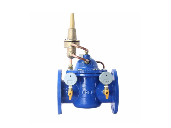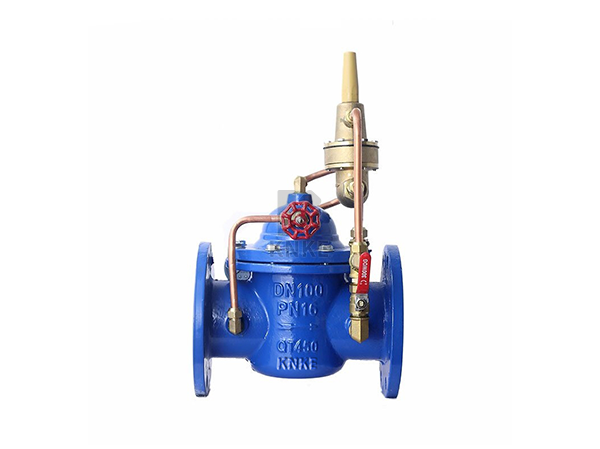 当主阀进出口间压差变化时,接管A与接管B间压差发生变化,此压差通过接管作用于导阀膜片两侧,改变导阀的开度。压差大时导阀开度大,控制室通过C管的下泄水量增大,主阀控制室压压力下降,主阀开度增大,主阀进出口间压差变小。反之,若主阀进出口间压差变小,则导阀开度变小,主阀控制室压力上升,推动主阀开度减小而使主阀压差增大。这种负反馈作用使主阀进出口间压差稳定在设定值上。设定针阀开度和导阀弹簧压力可设定主阀进出口间压差。